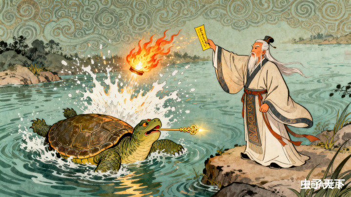 就在这时,姜子牙不知从哪儿冒了出来,手里的黄符“呼”地一下就燃烧了,扔向河面。
