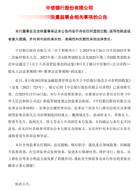 另一则公告显露,近日,该行收到《国度金融监督管制总局对于中信银行修改公司礼貌的批复》(金复〔2025〕725号),改换后的《中信银行股份有限公司礼貌》已获核准奏效。自2025年12月16日起,该行不再建设监事会,由董事会审计委员会讹诈《中华东说念主民共和国公司法》和监管轨制规矩的监事会权益,《中信银行股份有限公司监事会议事法律显露》、监事会议题管制目的、监事会下设各零星委员会相干议事法律显露等监事会相干公司解决轨制同期废止。魏国斌先生、孙祁祥女士、李蓉女士、程普升先生、张纯先生、曾玉芳女士不再担任该行监事,并均阐发与该行无不同主见,亦无任何其他事项需知会该行鼓舞及债权东说念主,无任何针对该行的正在发生或将要发生的诉讼和争议。